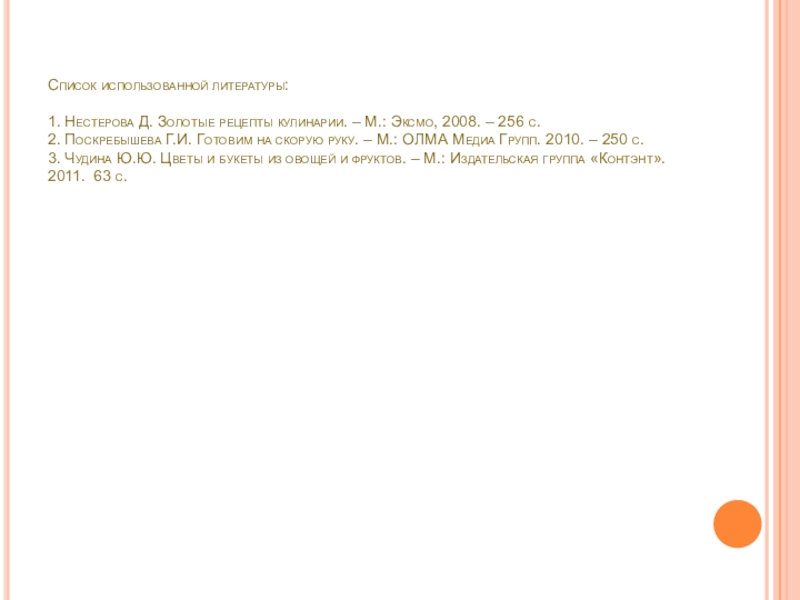 1. Нестерова Д. Золотые рецепты кулинарии. – М.: Эксмо,