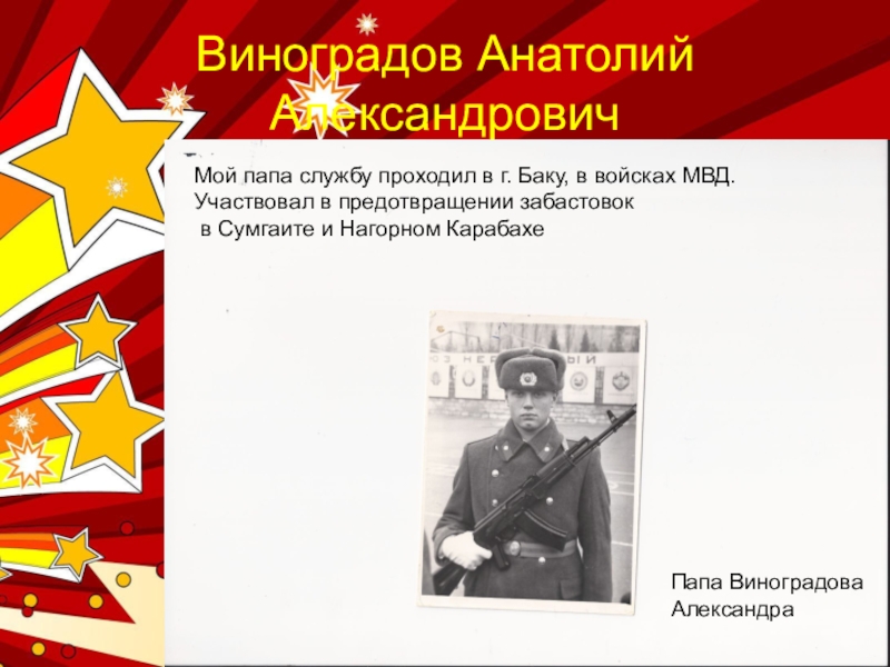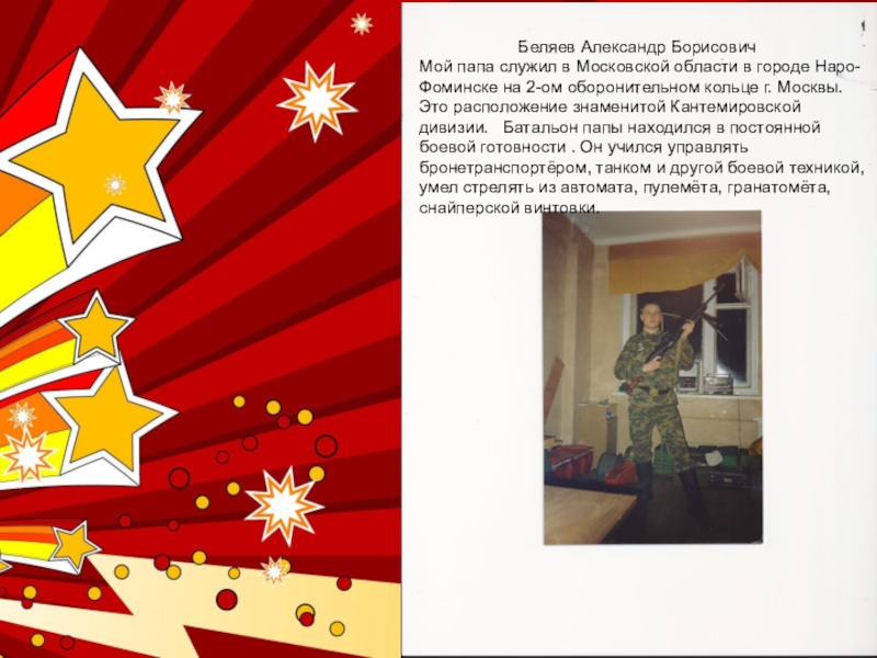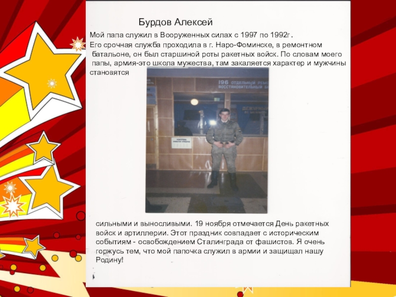 войск и артиллерии. Этот праздник совпадает с историческим событиям - освобождением Сталинграда от фашистов. Я очень горжусь тем, что мой папочка служил в армии и защищал нашу Родину!