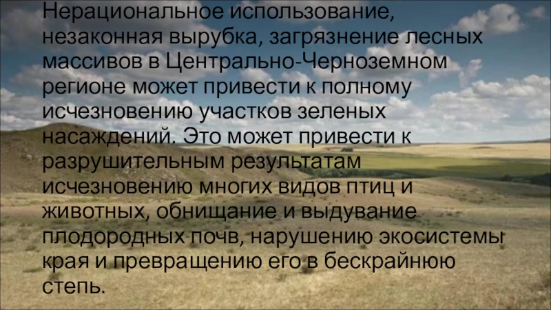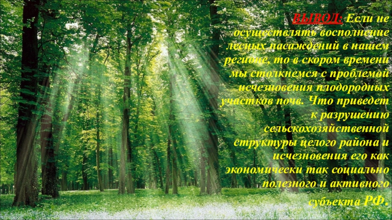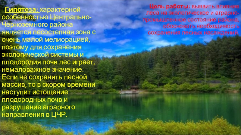 Цель работы: выявить влияние леса на экологическое и аграрно-промышленное состояние района, обосновать необходимость сохранения лесных насаждений.