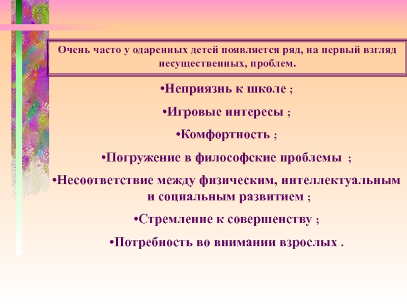 Несоответствие между физическим, интеллектуальным и социальным развитием ;