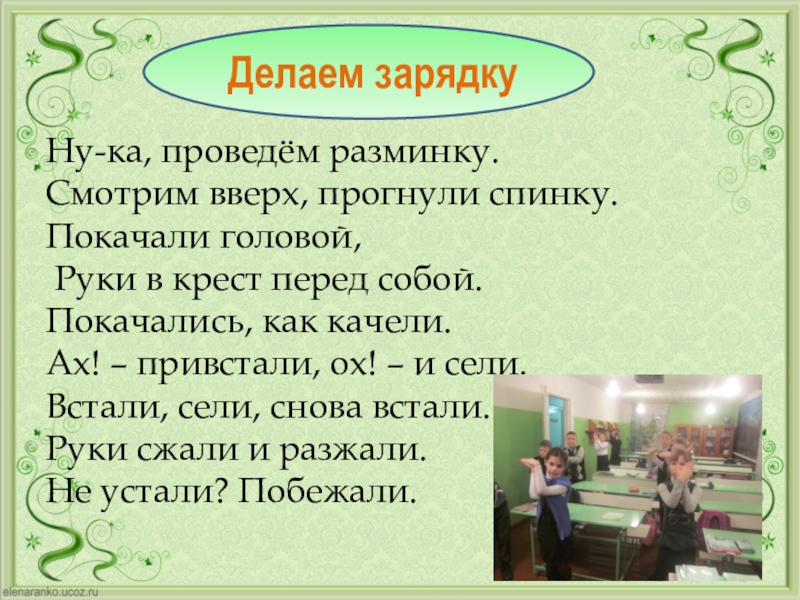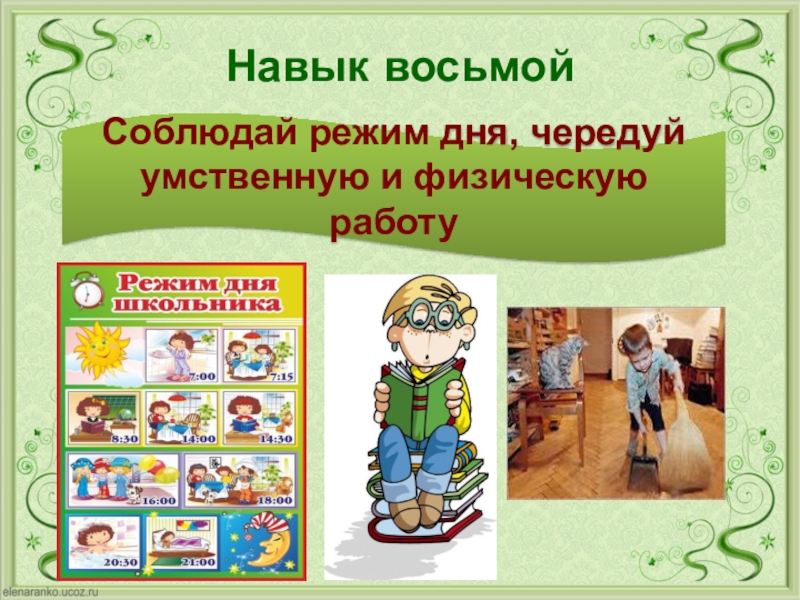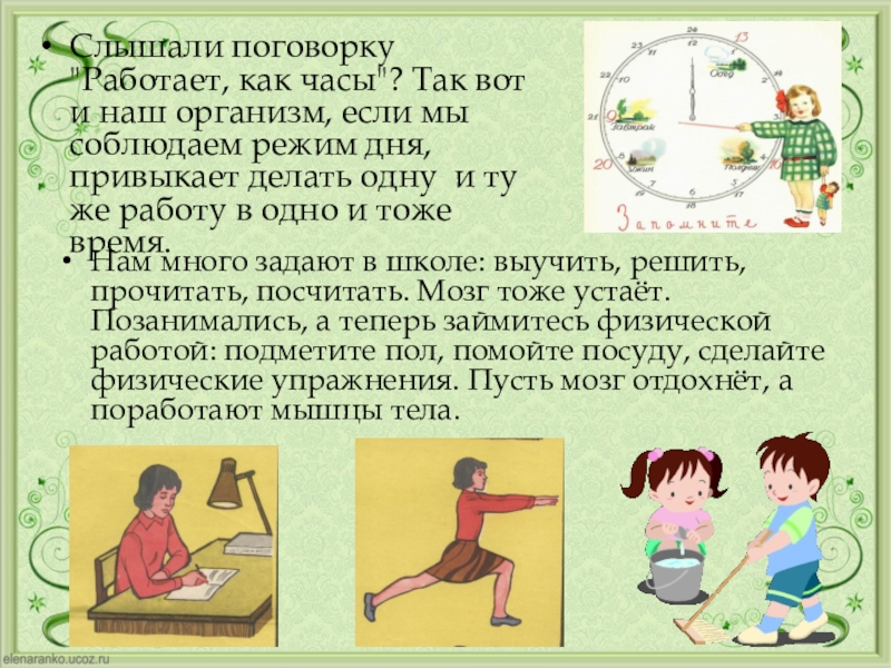 Нам много задают в школе: выучить, решить, прочитать, посчитать. Мозг тоже устаёт. Позанимались, а теперь займитесь физической работой: подметите пол, помойте посуду, сделайте физические упражнения. Пусть мозг отдохнёт, а поработают мышцы тела.