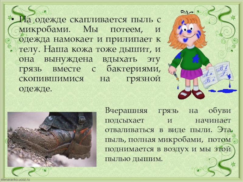 Вчерашняя грязь на обуви подсыхает и начинает отваливаться в виде пыли. Эта пыль, полная микробами, потом поднимается в воздух и мы этой пылью дышим.