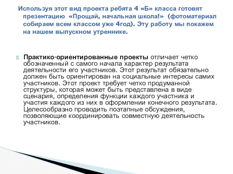 презентацию «Прощай, начальная школа!» (фотоматериал собираем всем классом уже 4год). Эту работу мы покажем на нашем выпускном утреннике.