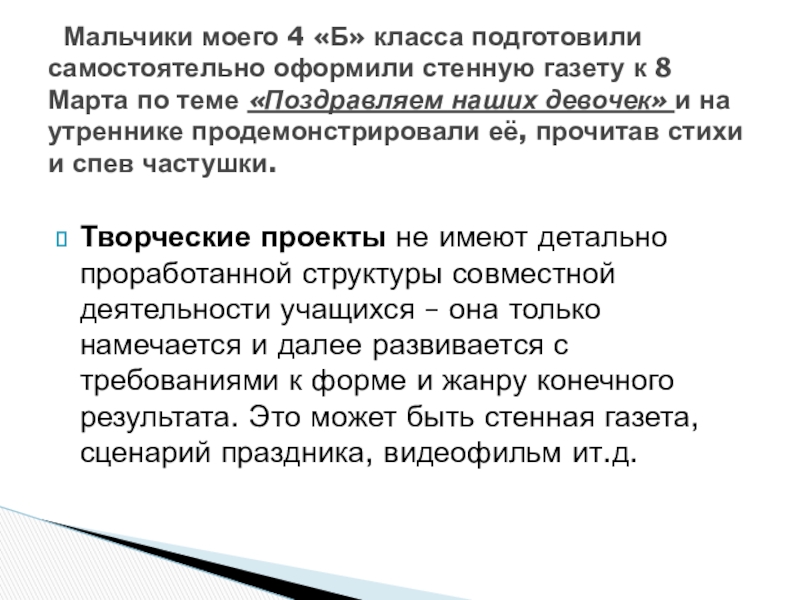 Мальчики моего 4 «Б» класса подготовили самостоятельно оформили стенную газету к 8 Марта по теме «Поздравляем наших девочек» и на утреннике продемонстрировали её, прочитав стихи и спев частушки.