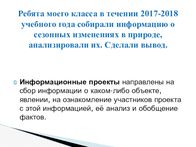 Ребята моего класса в течении 2017-2018 учебного года собирали информацию о сезонных изменениях в природе, анализировали их. Сделали вывод.