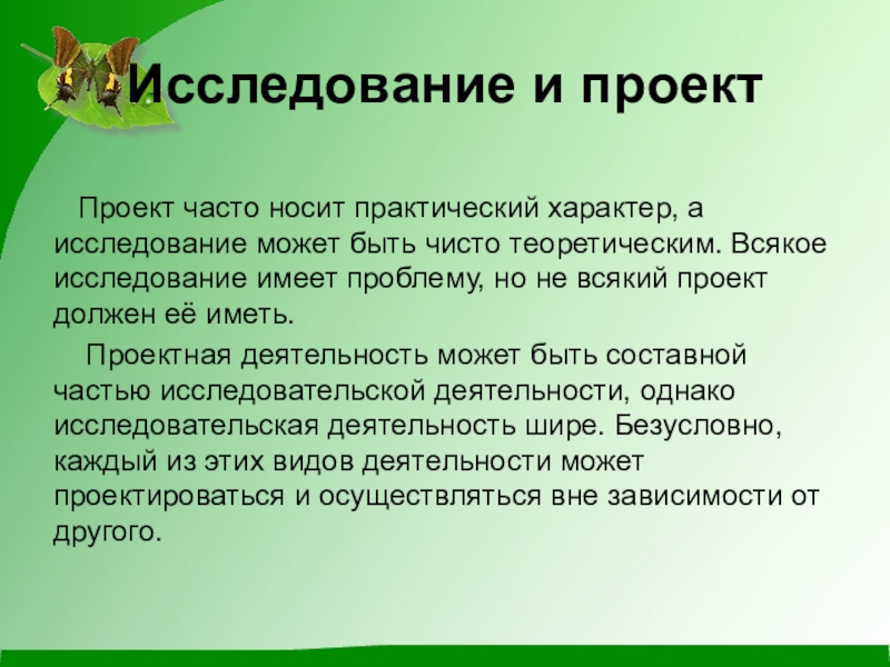 Исследование и проект  Проект часто носит практический характер, а исследование может быть чисто теоретическим. Всякое исследование