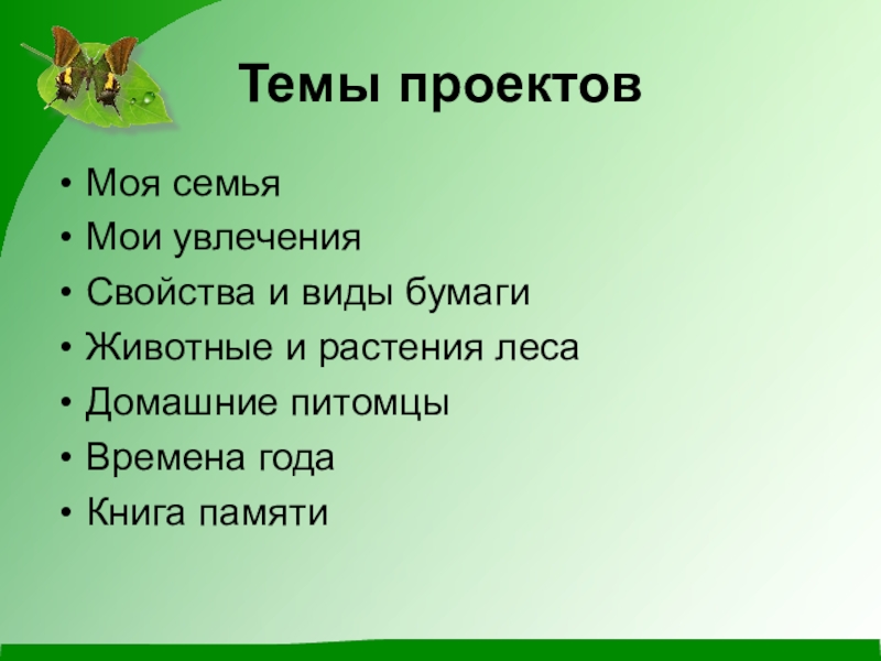 Темы проектовМоя семьяМои увлеченияСвойства и виды бумагиЖивотные и растения лесаДомашние питомцыВремена годаКнига памяти