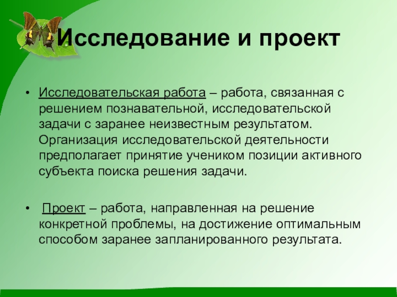 Исследование и проектИсследовательская работа – работа, связанная с решением познавательной, исследовательской задачи с заранее неизвестным результатом. Организация исследовательской деятельности предполагает принятие учеником позиции активного субъекта поиска решения задачи. Проект – работа, направленная на решение конкретной проблемы,