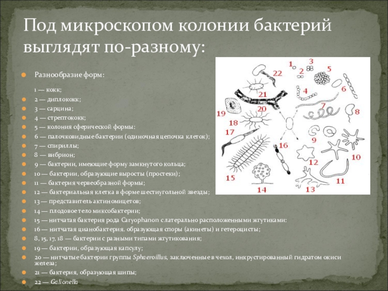 Слайд 31Под микроскопом колонии бактерий выглядят по-разному: