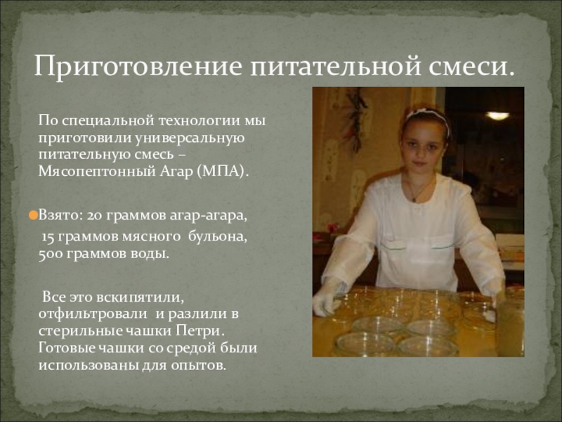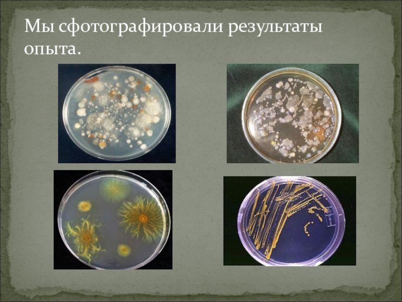 Все это вскипятили, отфильтровали и разлили в стерильные чашки Петри. Готовые чашки со средой были использованы для опытов.