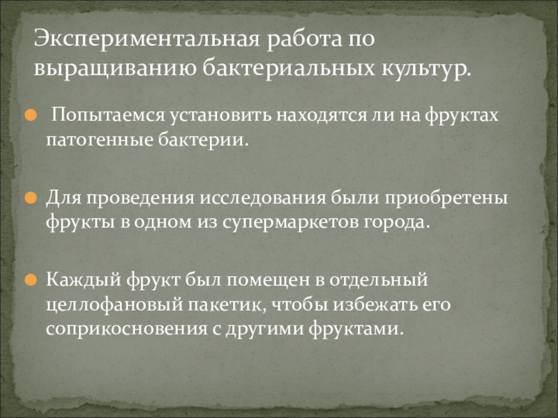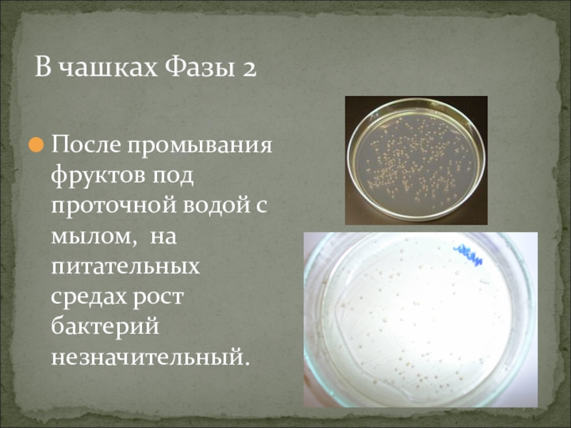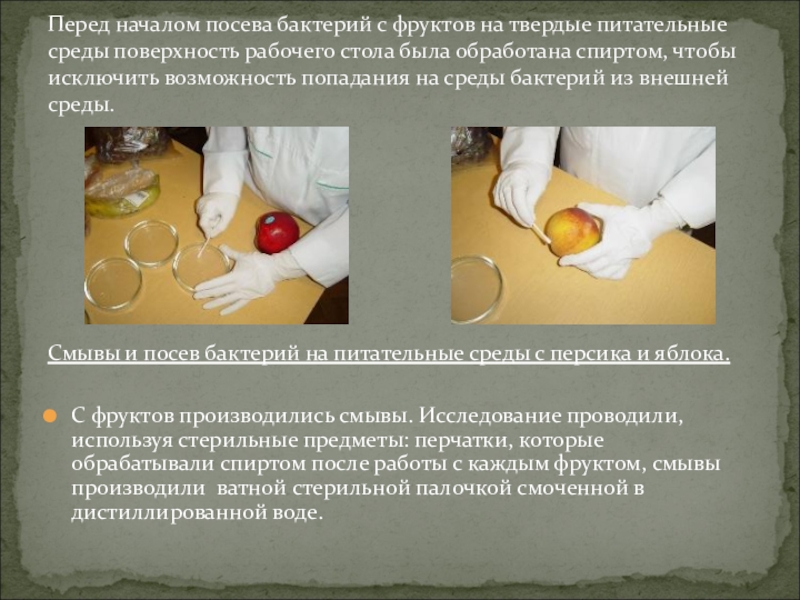 Слайд 13Перед началом посева бактерий с фруктов на твердые питательные среды поверхность