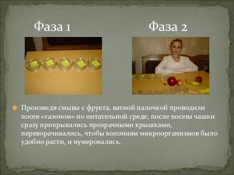 Произведя смывы с фрукта, ватной палочкой проводили посев «газоном» по питательной среде, после посева чашки сразу прикрывались прозрачными крышками, переворачивались, чтобы колониям микроорганизмов было удобно расти, и нумеровались.
