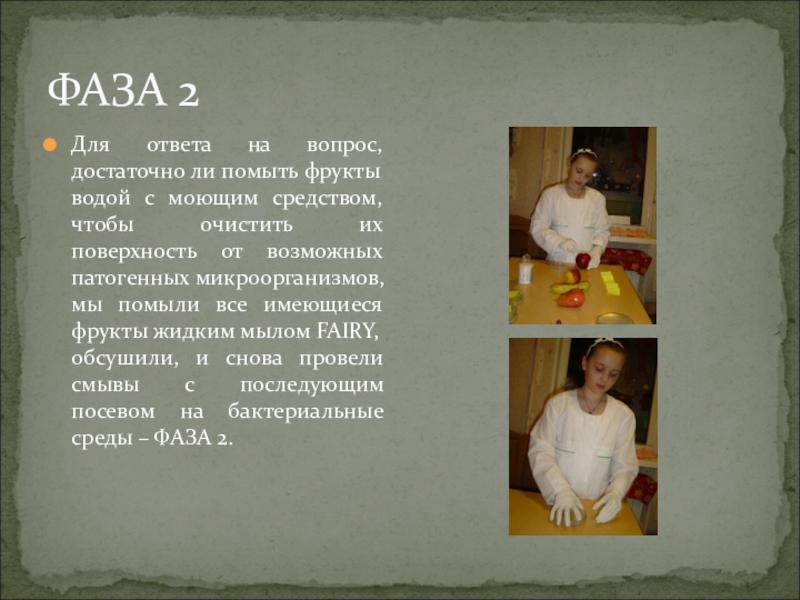 моющим средством, чтобы очистить их поверхность от возможных патогенных микроорганизмов, мы помыли все имеющиеся фрукты жидким мылом FAIRY, обсушили, и снова провели смывы с последующим посевом на бактериальные среды – ФАЗА 2.