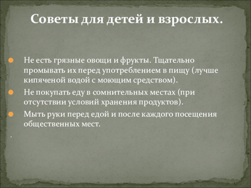 Слайд 25Не есть грязные овощи и фрукты. Тщательно промывать их перед употреблением