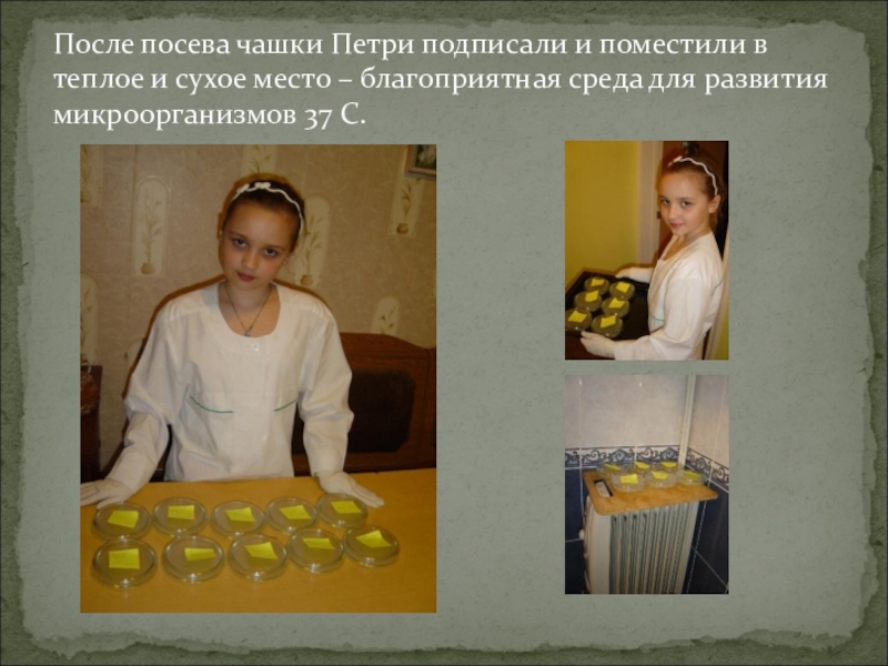 Слайд 17После посева чашки Петри подписали и поместили в теплое и сухое