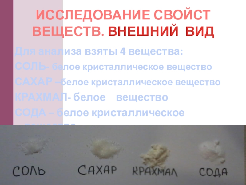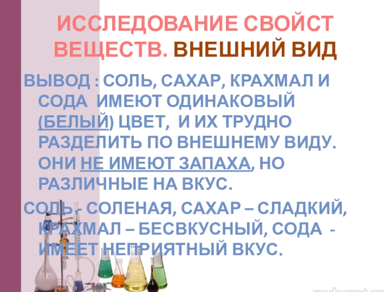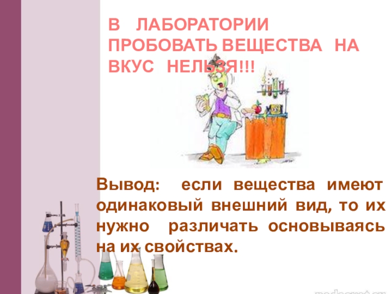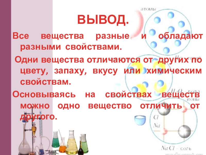 Вывод: если вещества имеют одинаковый внешний вид, то их нужно различать основываясь на их свойствах.