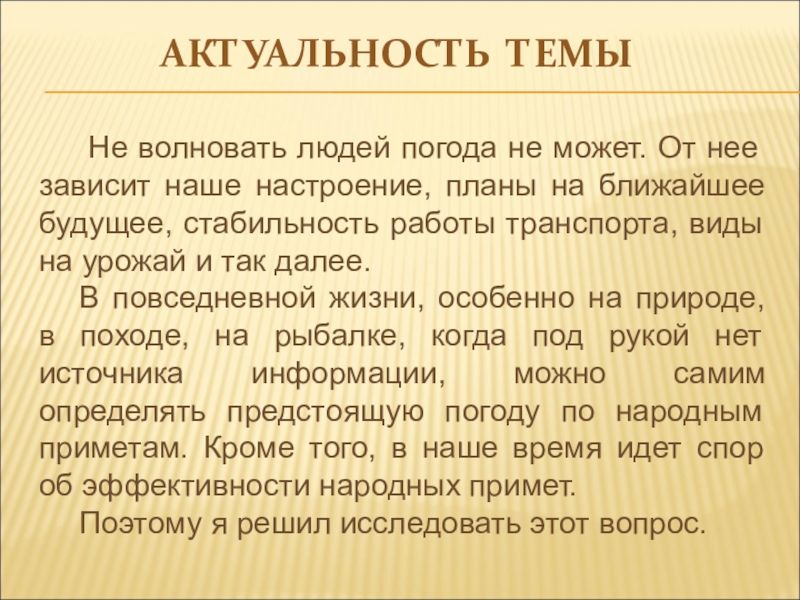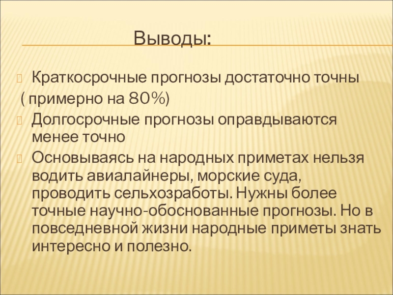 Основываясь на народных приметах нельзя водить авиалайнеры, морские суда, проводить сельхозработы. Нужны более точные научно-обоснованные прогнозы. Но в повседневной жизни народные приметы знать интересно и полезно.