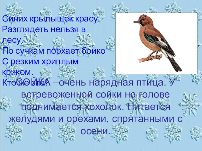 СОЙКА –очень нарядная птица. У встревоженной сойки на голове поднимается хохолок. Питается желудями и орехами, спрятанными с осени.