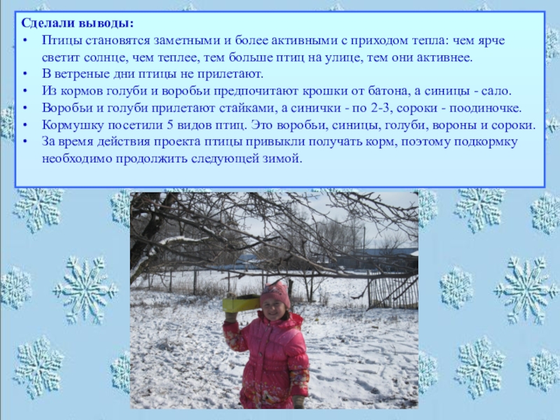 За время действия проекта птицы привыкли получать корм, поэтому подкормку необходимо продолжить следующей зимой.