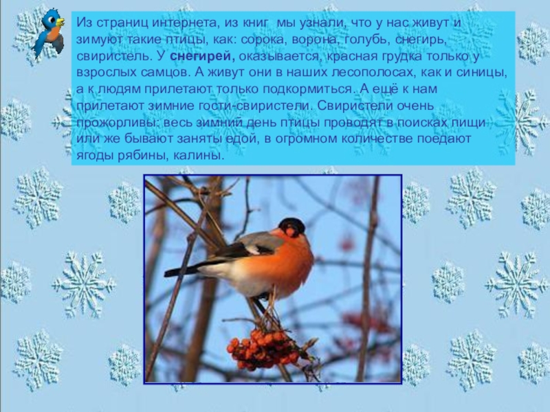 и зимуют такие птицы, как: сорока, ворона, голубь, снегирь, свиристель. У снегирей, оказывается, красная грудка только у взрослых самцов. А живут они в наших лесополосах, как и синицы, а к людям прилетают только подкормиться. А ещё к нам прилетают зимние гости-свиристели. Свиристели очень прожорливы: весь зимний день птицы проводят в поисках пищи или же бывают заняты едой, в огромном количестве поедают ягоды рябины, калины.