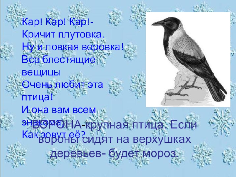 ВОРОНА-крупная птица. Если вороны сидят на верхушках деревьев- будет мороз.
