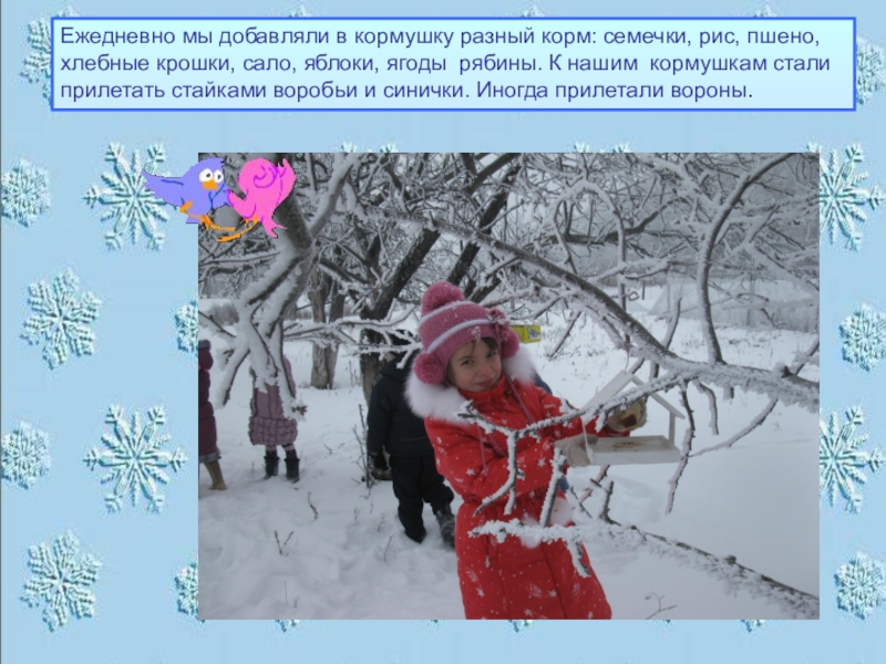 Слайд 18Ежедневно мы добавляли в кормушку разный корм: семечки, рис, пшено, хлебные