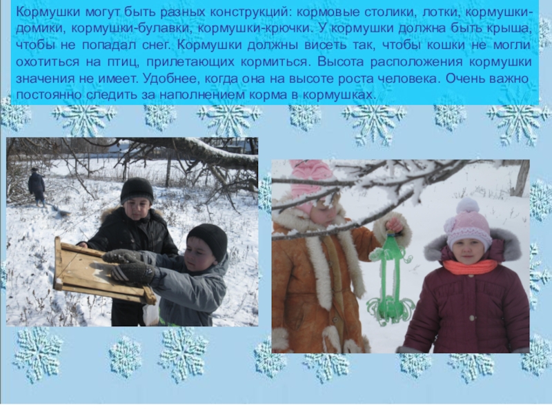 Слайд 15Кормушки могут быть разных конструкций: кормовые столики, лотки, кормушки-домики, кормушки-булавки, кормушки-крючки.