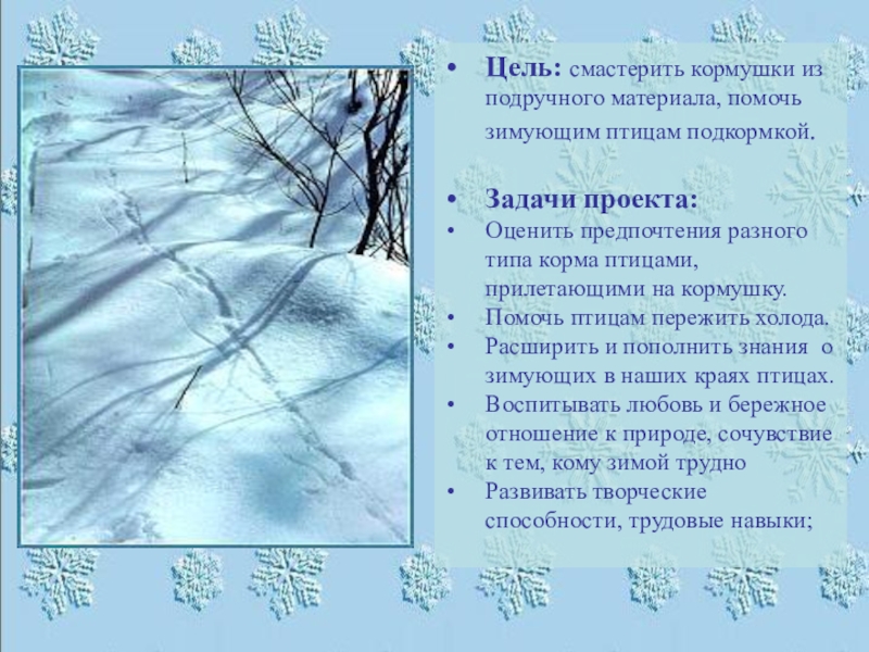 Слайд 4Цель: смастерить кормушки из подручного материала, помочь зимующим птицам подкормкой.