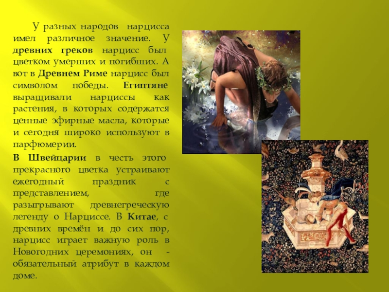 Слайд 6 У разных народов нарцисса имел различное значение. У древних греков нарцисс