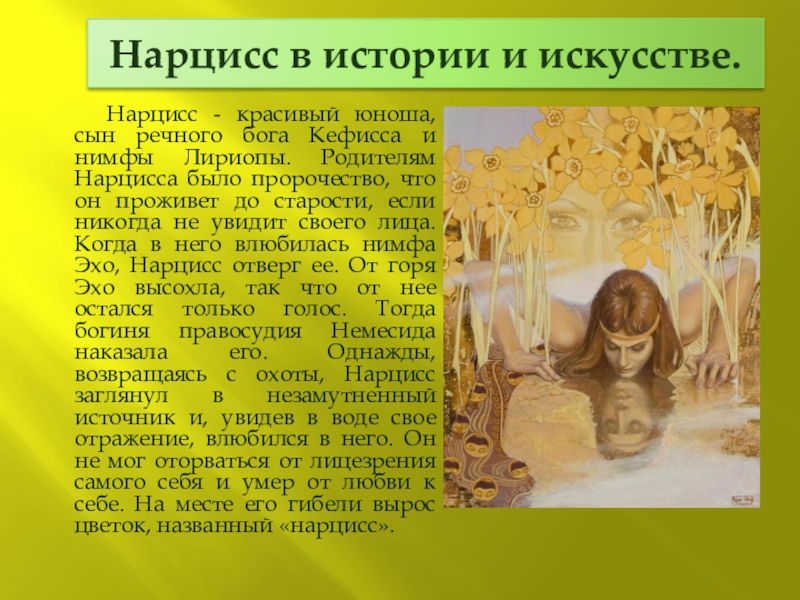 Слайд 7Образ нарцисса широко используется в искусстве и литературе. Особенно он полюбился