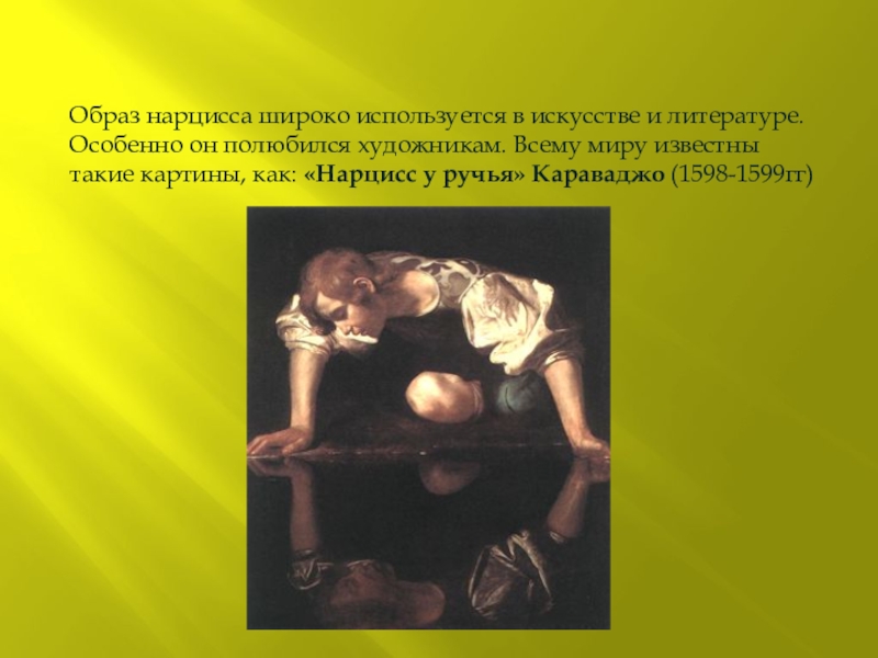 художникам. Всему миру известны такие картины, как: «Нарцисс у ручья» Караваджо (1598-1599гг)