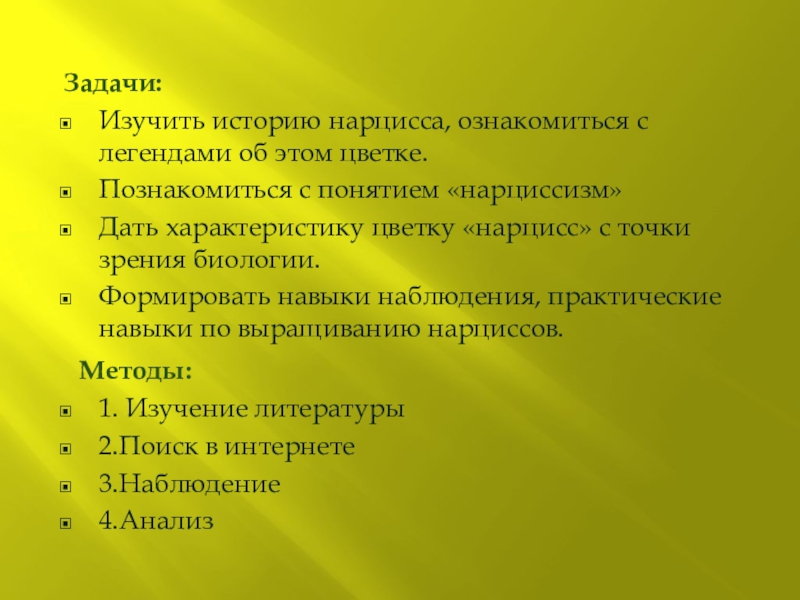 Изучить историю нарцисса, ознакомиться с легендами об этом цветке.