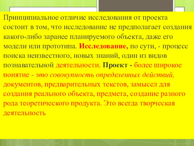 Слайд 3Принципиальное отличие исследования от проекта состоит в том, что исследование не