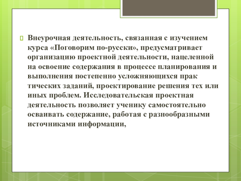 Слайд 8Внеурочная деятельность, связанная с изучением курса «Поговорим по-русски», предусматривает организацию проектной