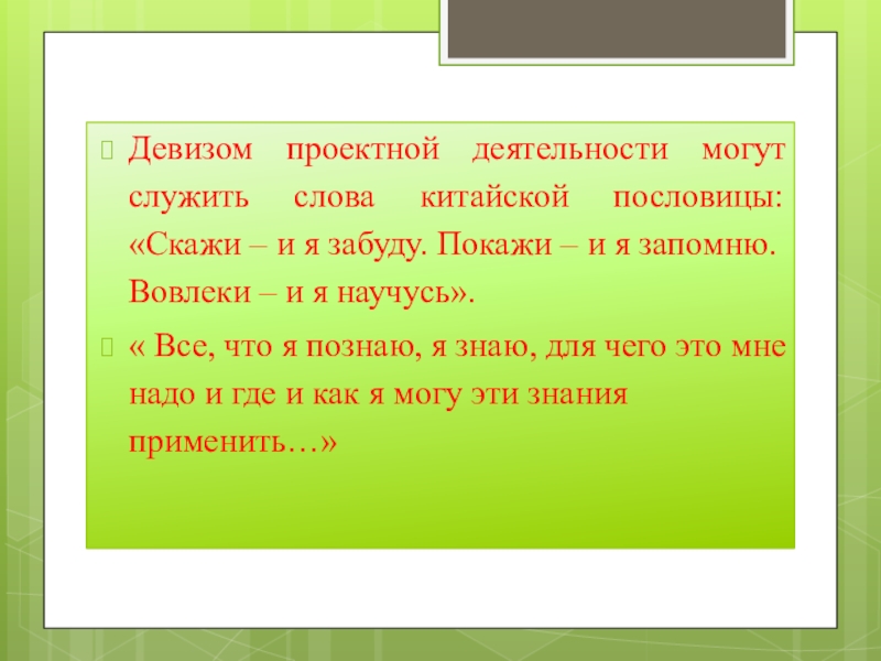 Слайд 4Девизом проектной деятельности могут служить слова китайской пословицы: «Скажи – и