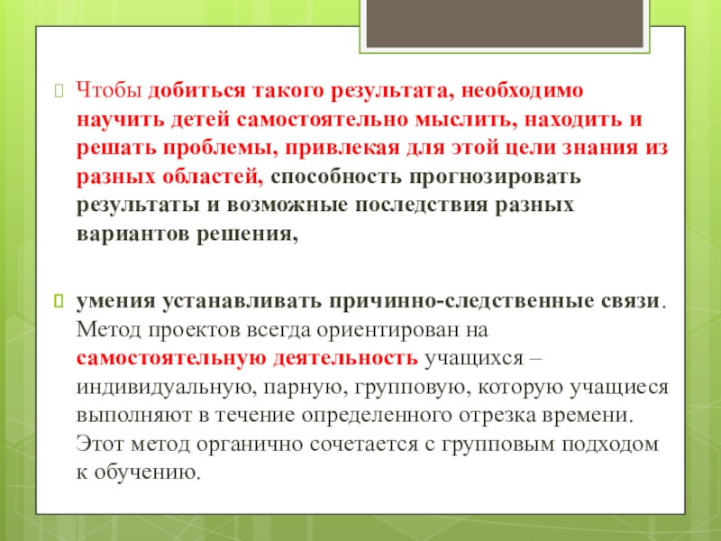 умения устанавливать причинно-следственные связи. Метод проектов всегда ориентирован на самостоятельную деятельность учащихся – индивидуальную, парную, групповую, которую учащиеся выполняют в течение определенного отрезка времени. Этот метод органично сочетается с групповым подходом к обучению.