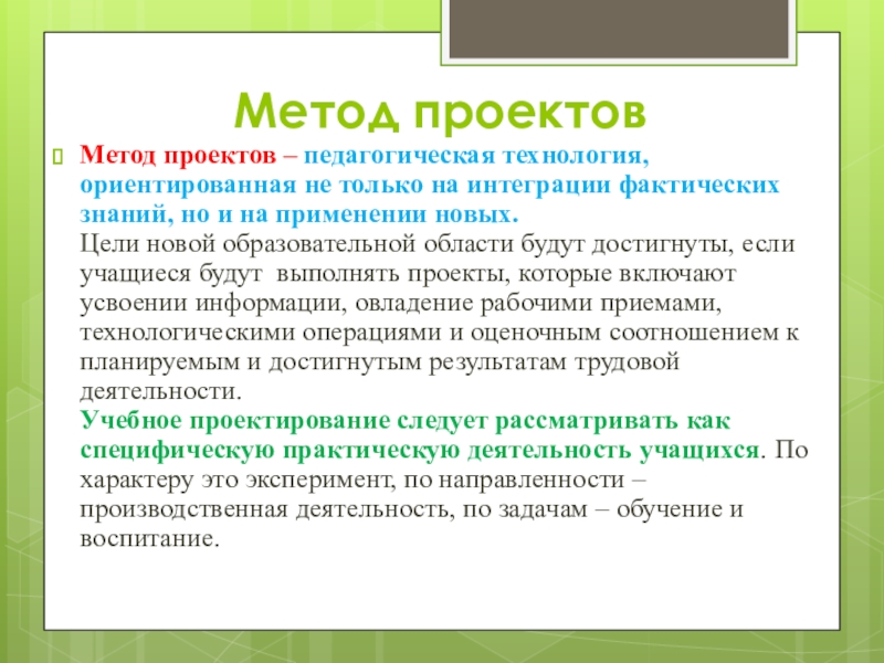 Учебное проектирование следует рассматривать как специфическую практическую деятельность учащихся. По характеру это эксперимент, по направленности – производственная деятельность, по задачам – обучение и воспитание.
