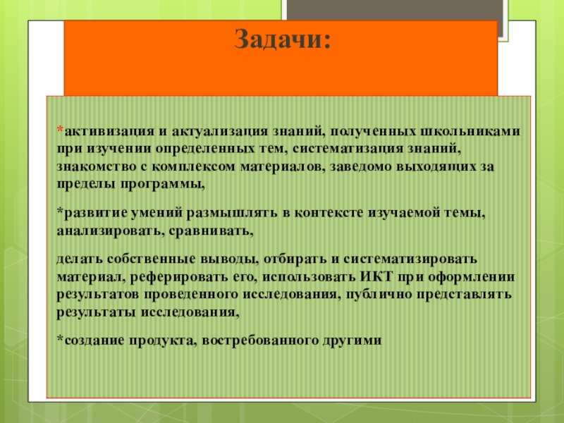 *активизация и актуализация знаний, полученных школьниками при изучении определенных тем, систематизация