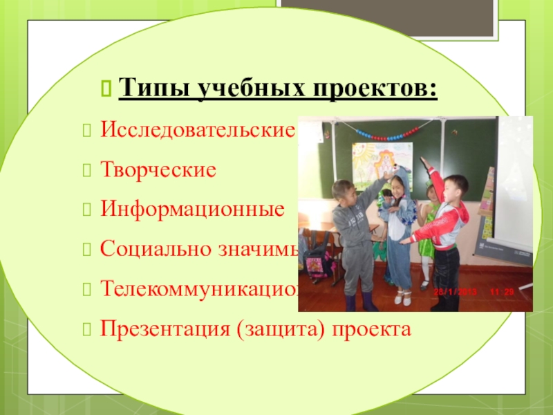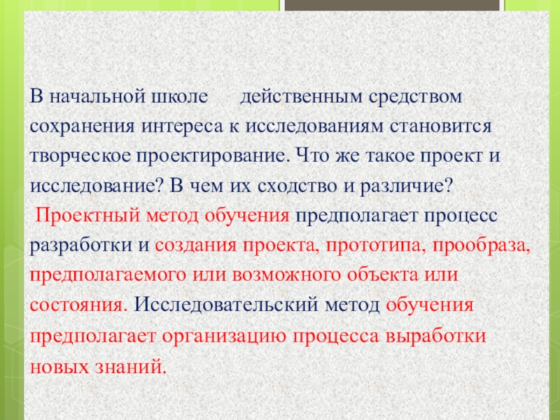 Проектный метод обучения предполагает процесс разработки и создания проекта, прототипа, прообраза, предполагаемого или возможного объекта или состояния. Исследовательский метод обучения предполагает организацию процесса выработки новых знаний.