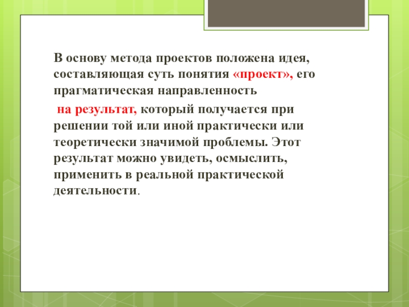 Слайд 10В основу метода проектов положена идея, составляющая суть понятия «проект», его
