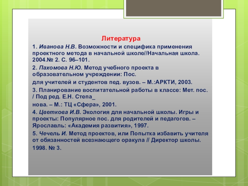 4. Цветкова И.В. Экология для начальной школы. Игры и проекты: Популярное пос. для родителей и педагогов. – Ярославль: «Академия развития», 1997.