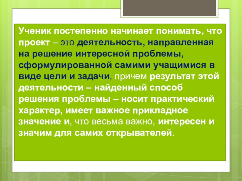 Слайд 7Ученик постепенно начинает понимать, что проект – это деятельность, направленная на