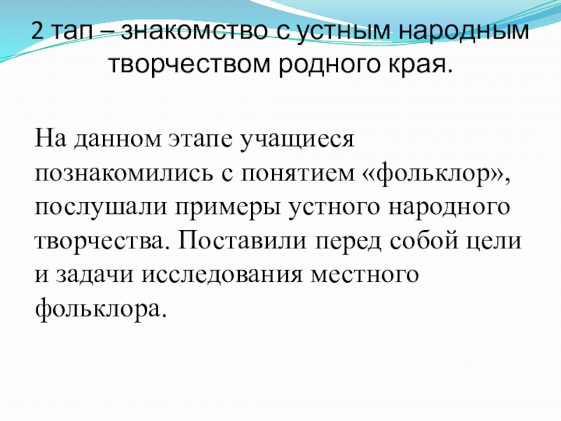 Слайд 102 тап – знакомство с устным народным творчеством родного края.