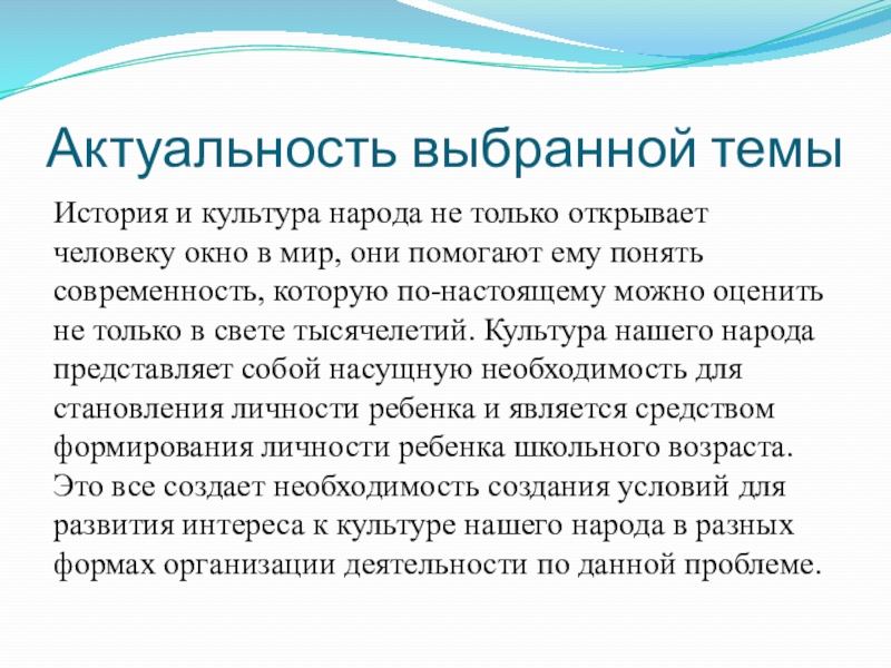 в мир, они помогают ему понять современность, которую по-настоящему можно оценить не только в свете тысячелетий. Культура нашего народа представляет собой насущную необходимость для становления личности ребенка и является средством формирования личности ребенка школьного возраста. Это все создает необходимость создания условий для развития интереса к культуре нашего народа в разных формах организации деятельности по данной проблеме.