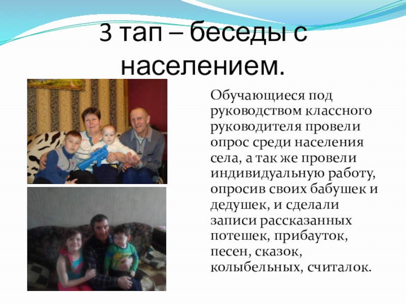 опрос среди населения села, а так же провели индивидуальную работу, опросив своих бабушек и дедушек, и сделали записи рассказанных потешек, прибауток, песен, сказок, колыбельных, считалок.