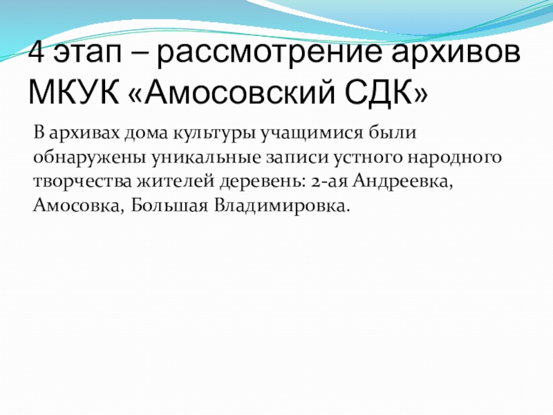 Слайд 124 этап – рассмотрение архивов МКУК «Амосовский СДК»