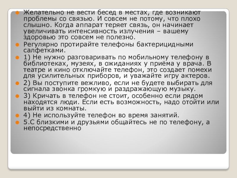 Слайд 19Желательно не вести бесед в местах, где возникают проблемы со связью.