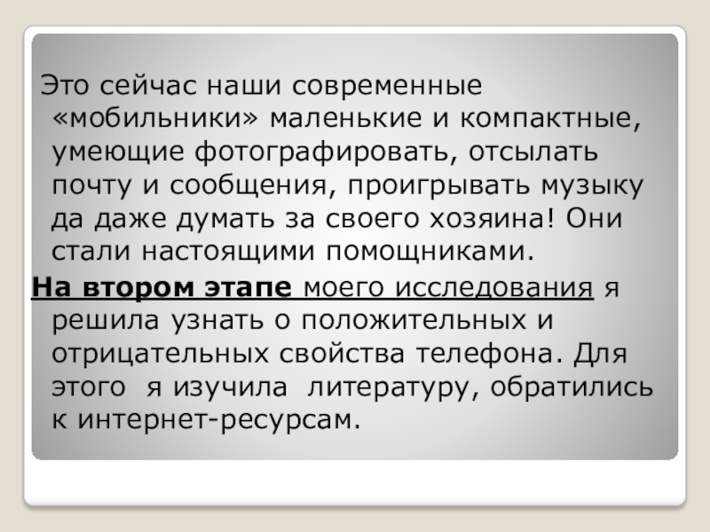 На втором этапе моего исследования я решила узнать о положительных и отрицательных свойства телефона. Для этого я изучила литературу, обратились к интернет-ресурсам.