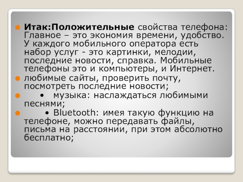 Слайд 8Итак:Положительные свойства телефона: Главное – это экономия времени, удобство. У каждого