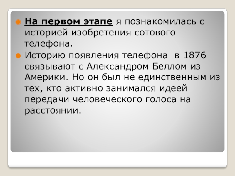 Слайд 4На первом этапе я познакомилась с историей изобретения сотового телефона.